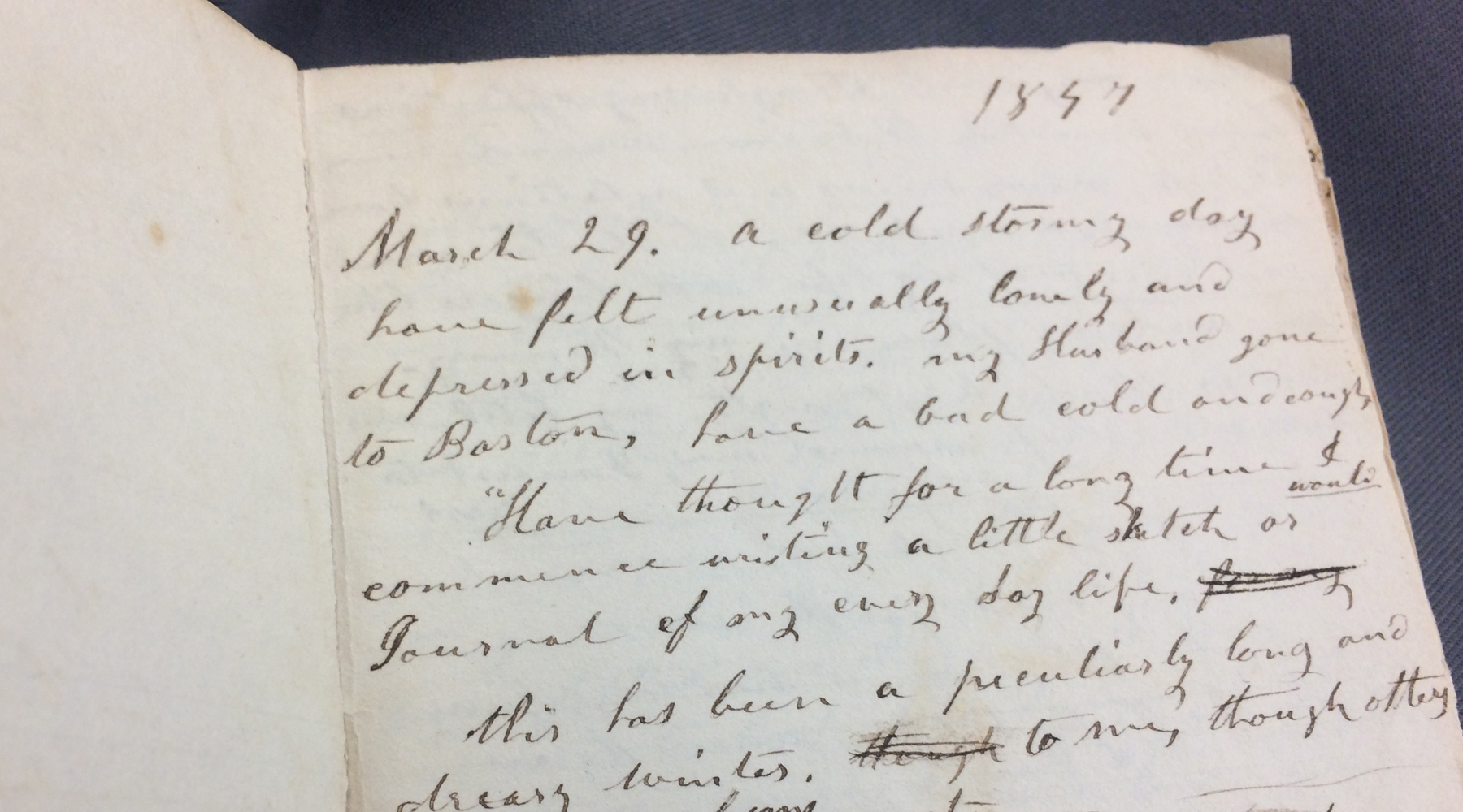 One example in our collections is the diary of Jane Monroe, wife of a farmer and lumber dealer in Waterford, Maine. Jane kept a diary for just a few months in 1847. She begins by writing, “A cold stormy day, have felt unusually lonely and depressed in spirits,” and provides a valuable record of her life and inner thoughts for the next few months.