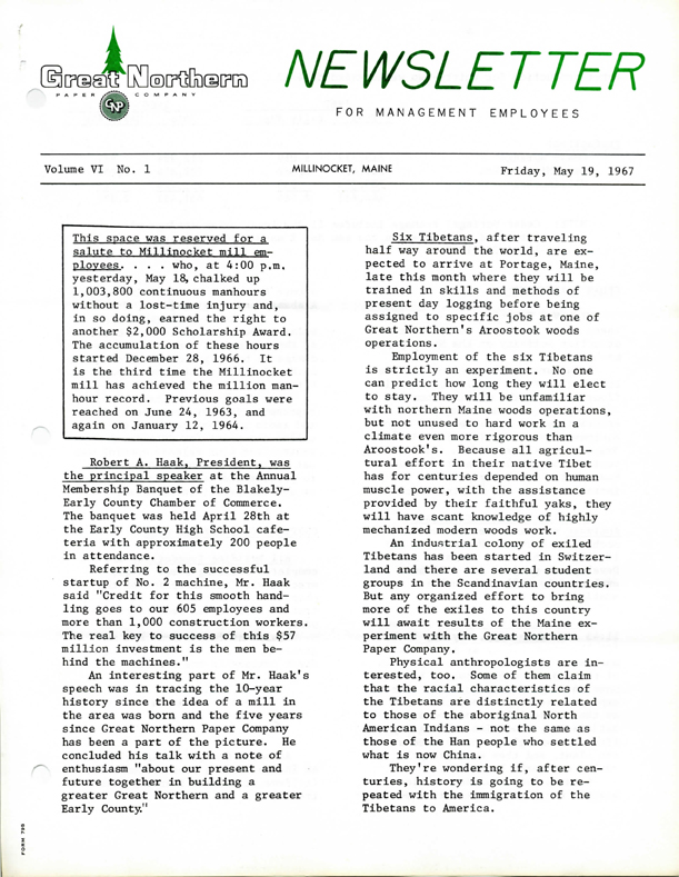 The first appeared May 19, 1967 and began, “Six Tibetans, after traveling half way around the world, are expected to arrive at Portage, Maine, later this month where they will be trained in skills and methods of present day logging before being assigned to specific jobs at one of Great Northern’s Aroostook woods operations.”
