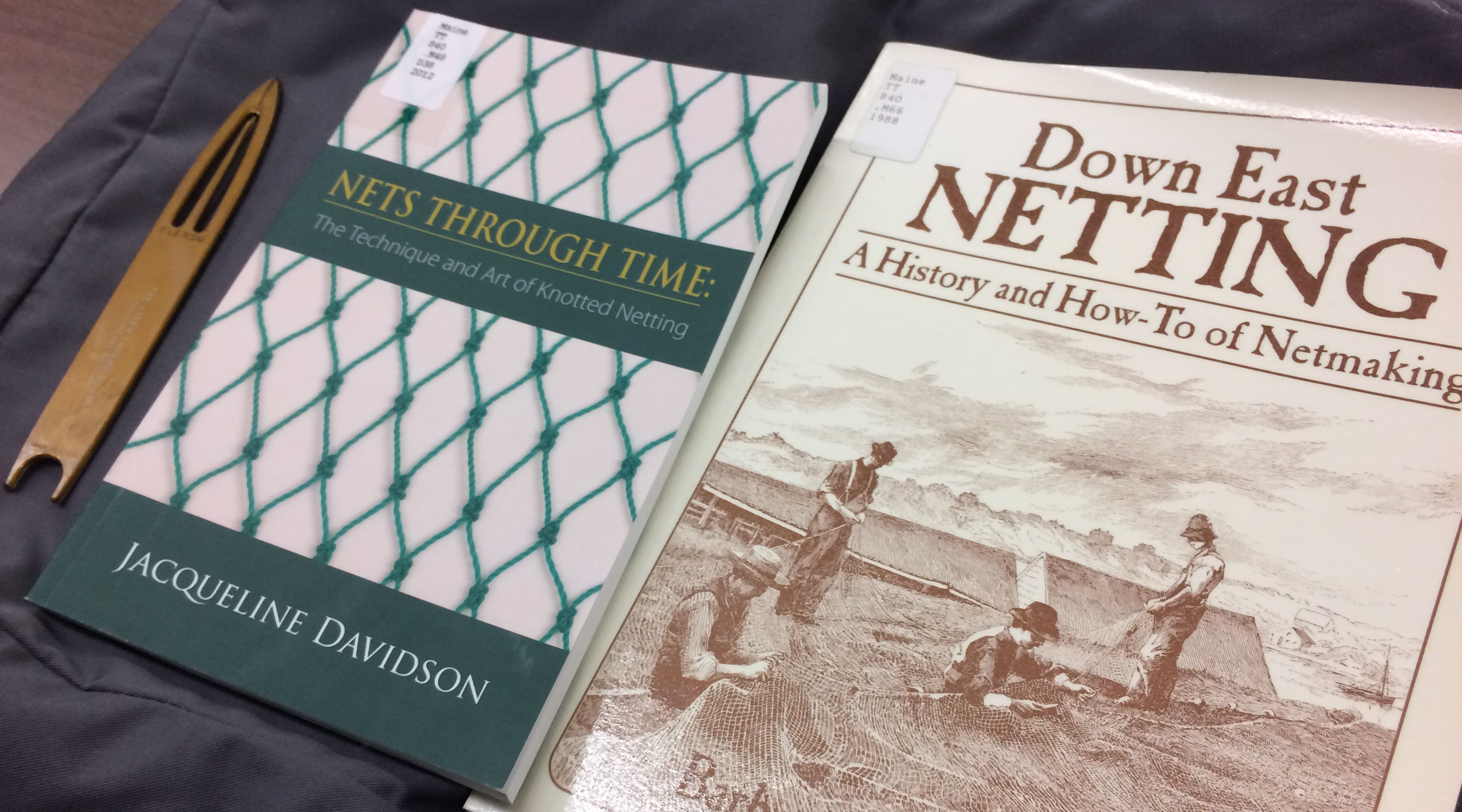 Our books on netting are among Elaine’s favorites, particularly because she was given her mother-in-law’s netting needle. At one time, netting was a major industry for coastal Maine. Techniques were used create and repair fishermen’s nets and glass float bags, and also for lace and many other decorative handicrafts. Books within our collections on this topic include Down East Netting: A History and How-To of Netmaking by Barbara M. Morton and Nets Through Time: The Technique and Art of Knotted Netting by Jacqueline Davidson.
