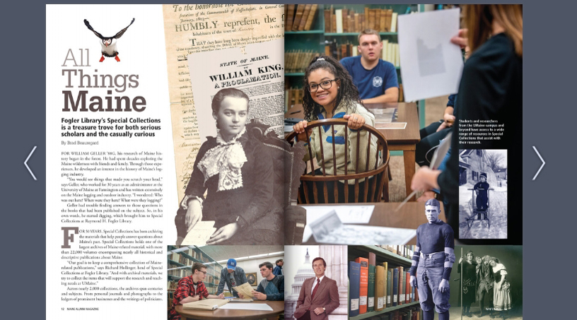 Fogler Library’s Special Collections Department is highlighted in the Winter 2020 issue of MAINE Alumni Magazine in an article by Brad Beauregard, “All Things Maine: Fogler Library’s Special Collections is a treasure trove for both serious scholars and the casually curious.” Special thanks to the University of Maine Alumni Association and to the researchers who were willing to be interviewed. The article starts on page 12 of the Winter 2020 issue, found online on the MAINE Alumni Magazine webpage.