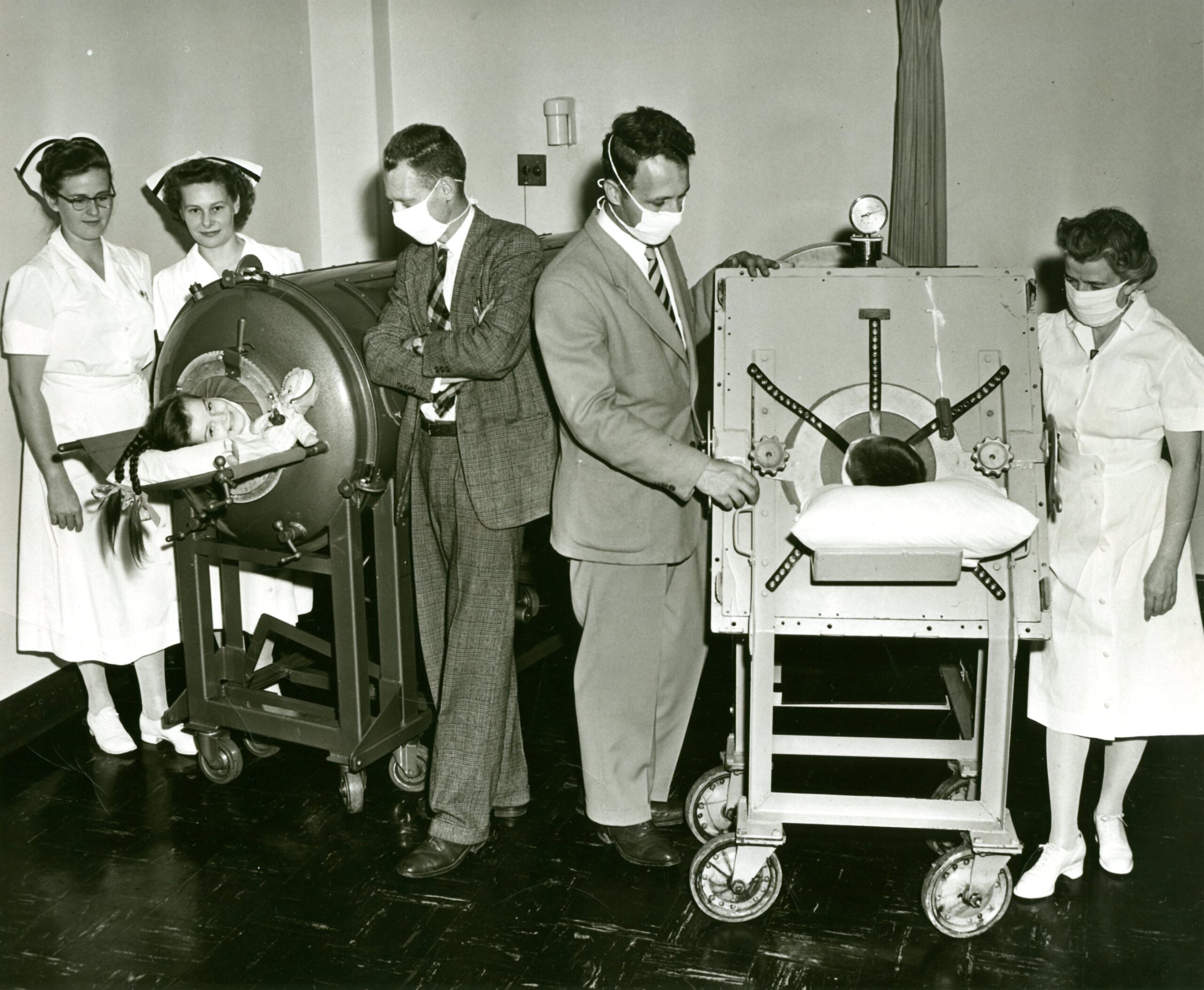 Another photograph from the 1950s in the collection shows staff members wearing face masks to help protect young patients in treatment.