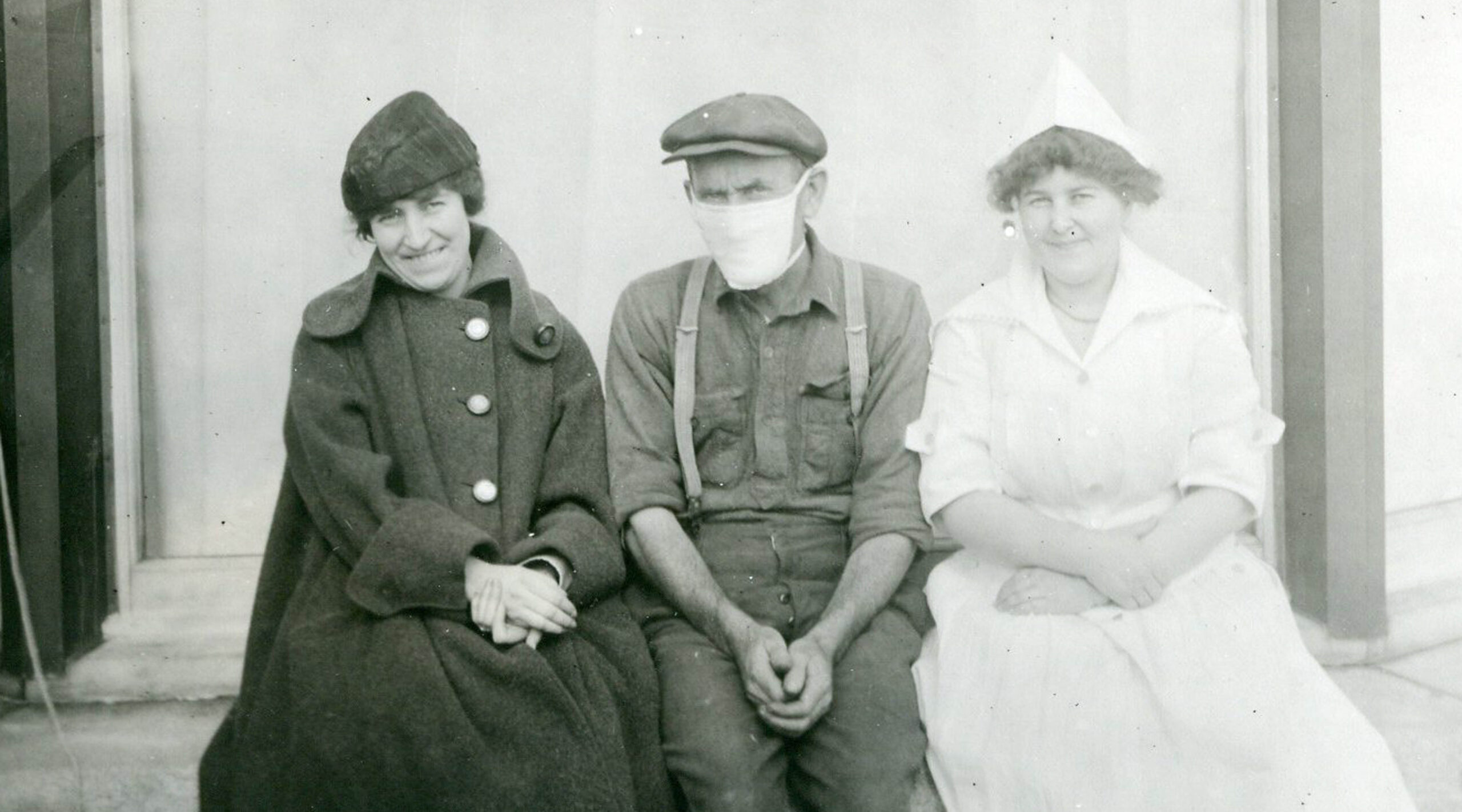 Several recent articles have highlighted the history of wearing face masks to prevent the spread of disease, particularly during the influenza pandemic of 1918-1919. This brought to mind a photograph in our Eastern Maine General Hospital School of Nursing Collection of an unidentified patient wearing a face mask, seated with two women, one of them in her nurse’s uniform. A handwritten note on the back provides date as 1917 and simply says this is “the man we used to call Mike.”